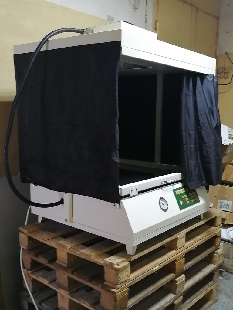 Настольное исполнение рамы позволяет компактно её размещать на производстве. Все копировальные рамы прошли тестирование на рвномерность вакуума и светового излучения, упакованы в ящики.